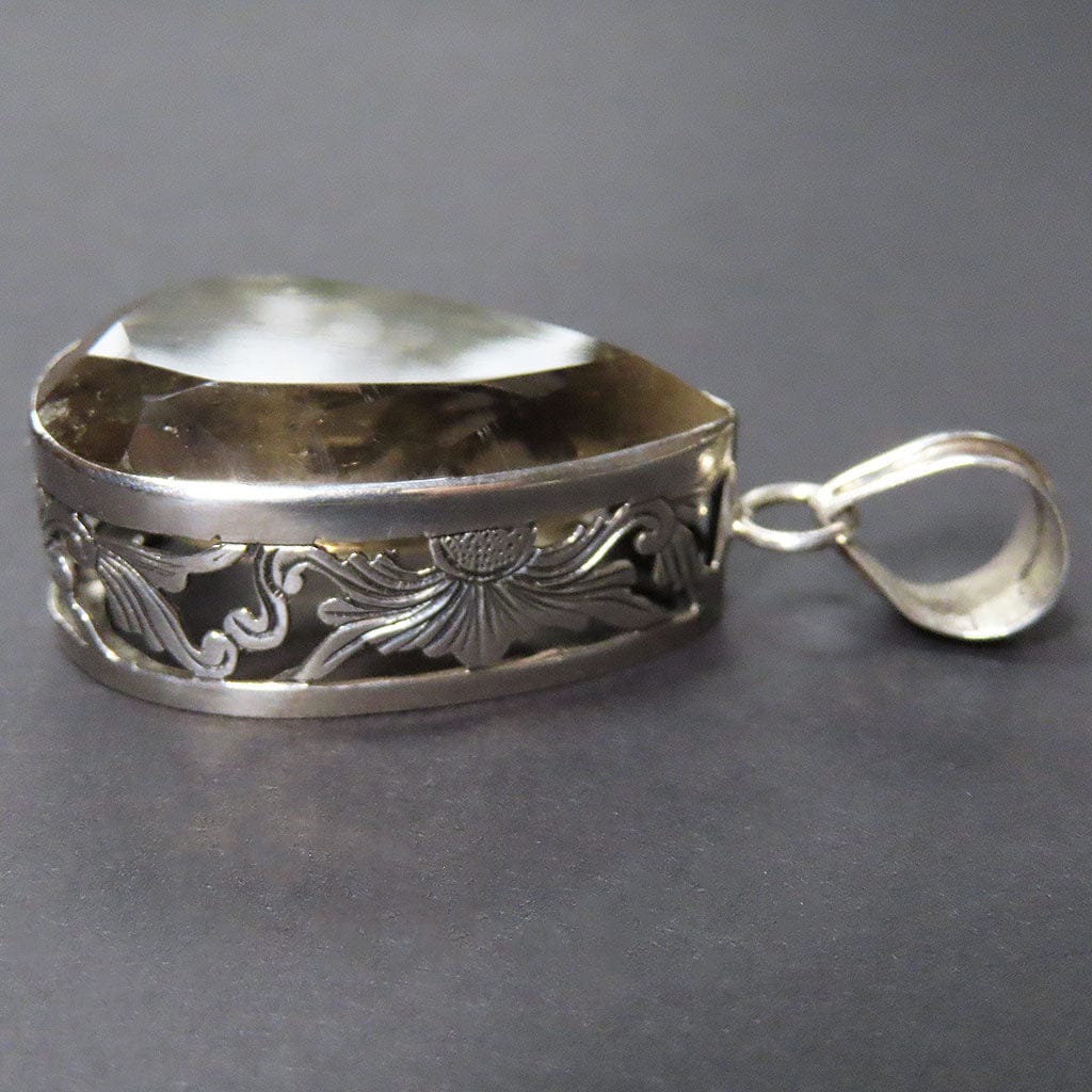 Un fantástico colgante elaborado con una lágrima pulida de cuarzo ahumado facetado de Brasil, engastado en plata de ley de... Leer más...