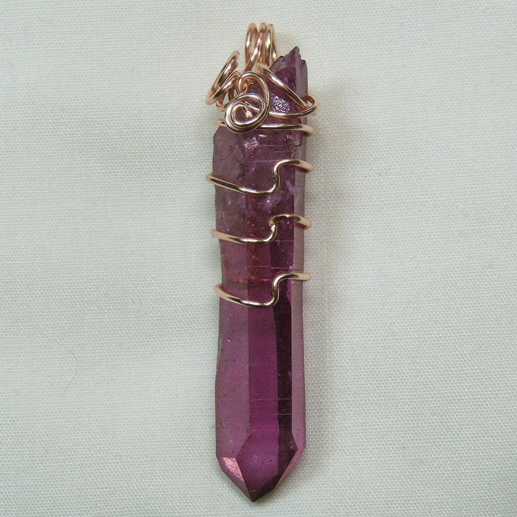 Un maravilloso colgante envuelto en alambre, hecho con una punta de cristal de cuarzo Aura Niebla Púrpura (enriquecida con oro)... Leer más...