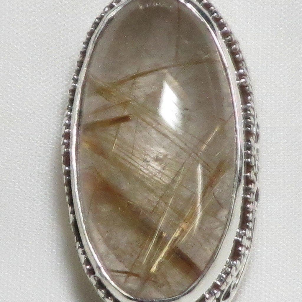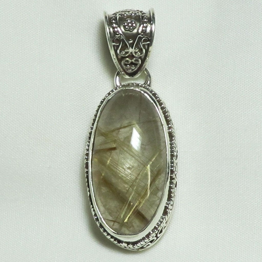 Un fabuloso colgante elaborado con una cabina ovalada pulida de cuarzo rutilado engastada en plata de ley de estilo antiguo.... Leer más...