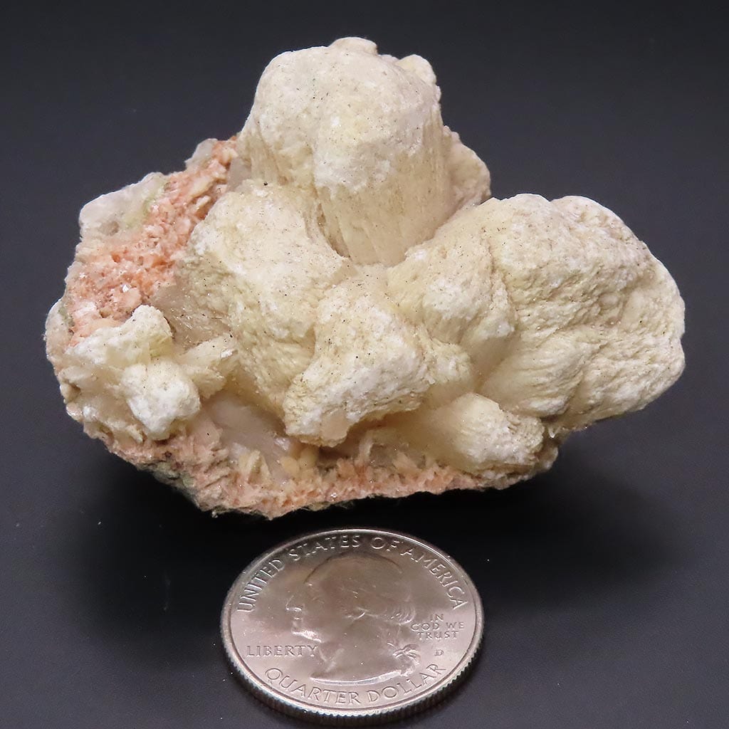 Un hermoso conjunto de láminas de estilbita color melocotón y heulandita rosa sobre cuarzo blanco drusa de Jalgaon, India. Pesa... Leer más...