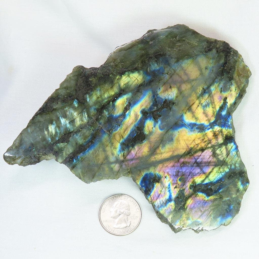 Una fabulosa losa de labradorita pulida de 1 lado de Madagascar que muestra muchos destellos de color dorado/azul/púrpura. Pesa 14,5... Leer más...