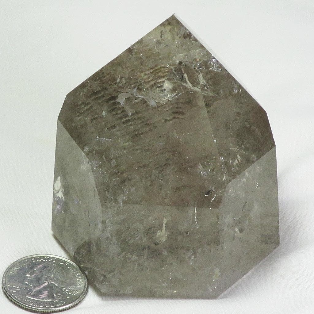 Una fabulosa punta de cristal de cuarzo Lodolita ahumado pulido de Brasil que tiene un paisaje rocoso en capas grises... Leer más...