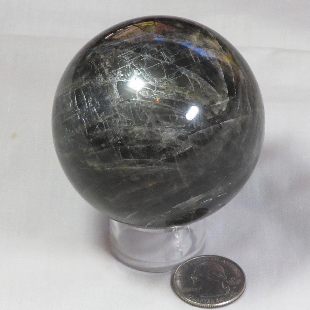 Una extraordinaria esfera de piedra lunar negra pulida de Madagascar que tiene dos buenas zonas de Schiller plateadas. Viene con... Leer más...