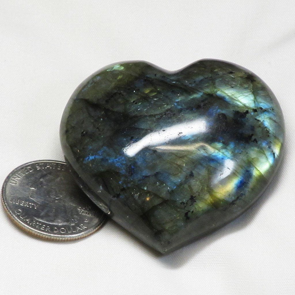 Un maravilloso corazón de labradorita pulida de Madagascar que muestra muchos destellos de color dorado/verde/azul en ambos lados. Tamaño: 1... Leer más...