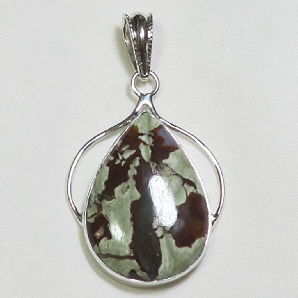 A wonderful pendant made from a hand polished tear drop cab of rainforest jasper from Brazil that is set in... Read more