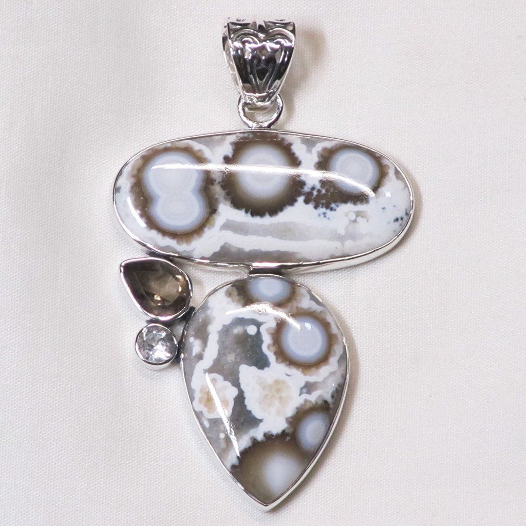 An absolutely magnificent pendant made with two polished ocean jasper cabs from Madagascar that are accented with faceted smoky quartz... Read more