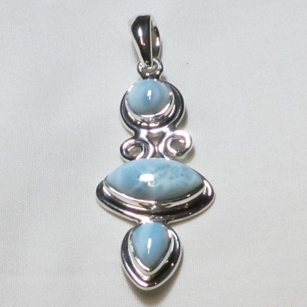 A magnificent pendant made with three polished larimar cabs from the Dominican Republic that are set in smooth style sterling... Read more