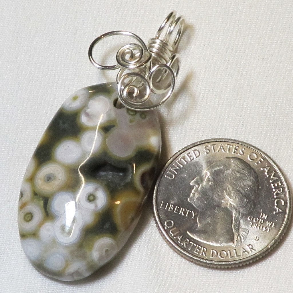 A fantastic wire wrapped pendant made with a polished piece of ocean jasper from Madagascar that is finished with tarnish... Read more