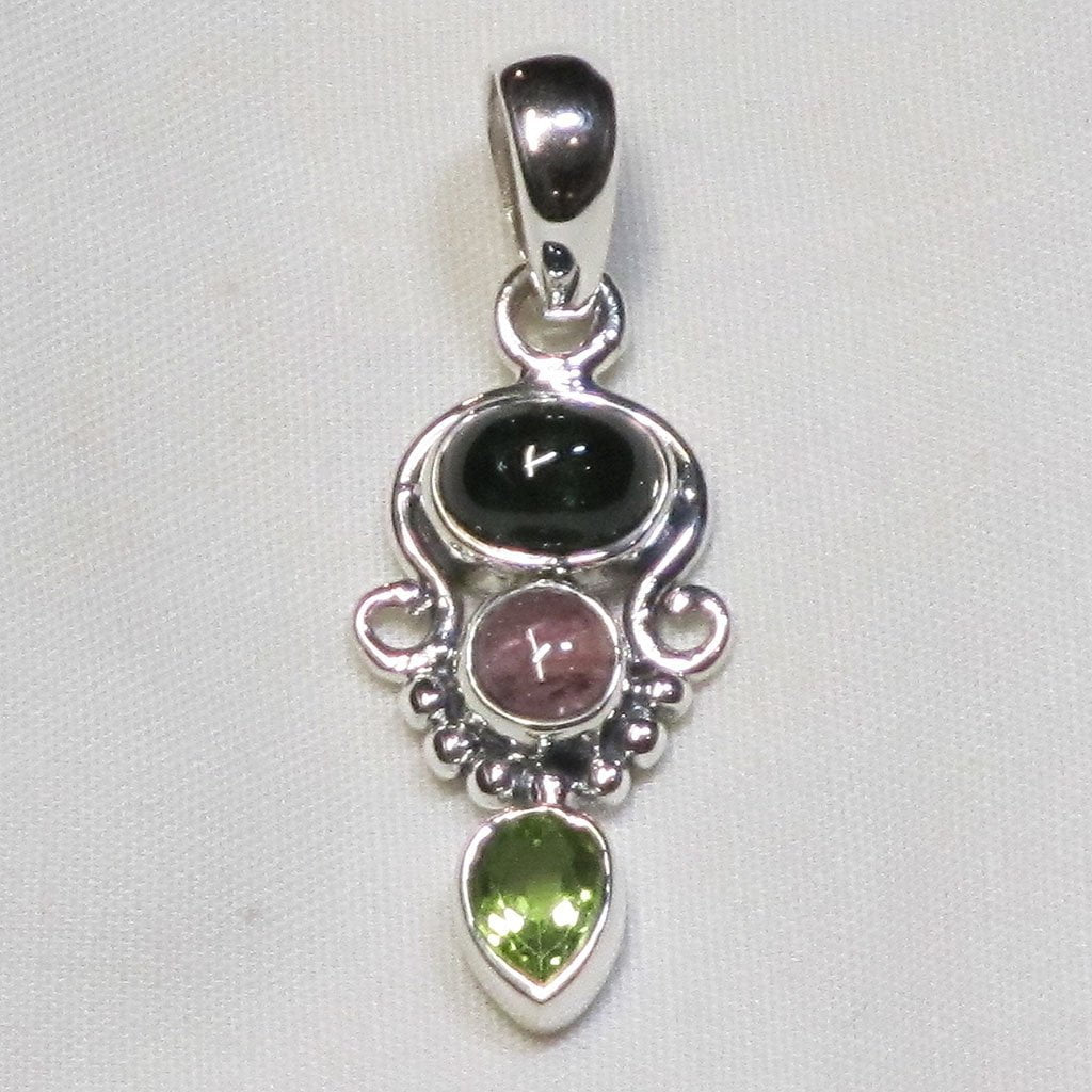 A fabulous pendant made with 2 polished tourmaline cabs and a faceted peridot. Top tourmaline is dark green and the... Read more