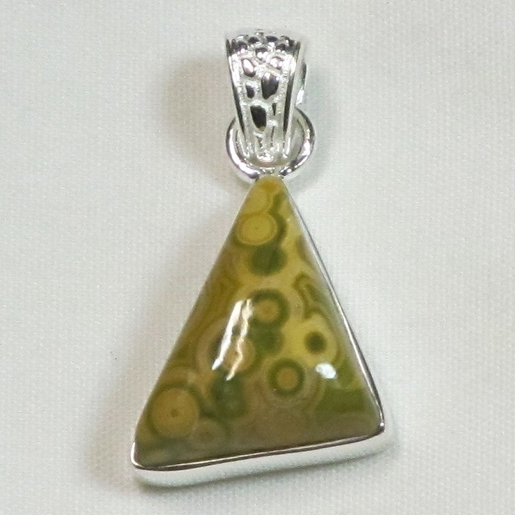 A wonderful pendant made with a polished triangle of ocean jasper from Madagascar that is set in smooth style sterling... Read more