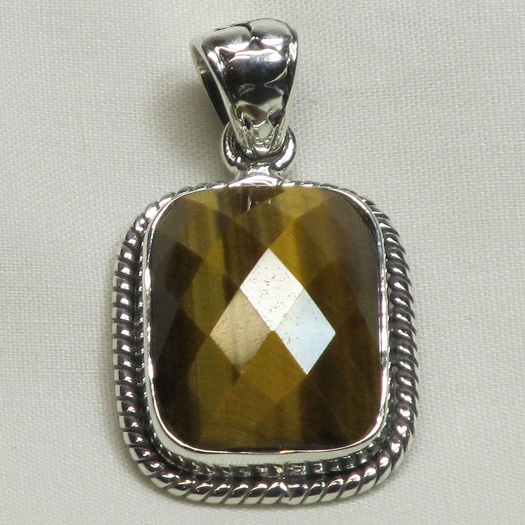 A marvelous pendant made with faceted gemmy tiger eye from central Africa that is set in contemporary style sterling silver. ... Read more