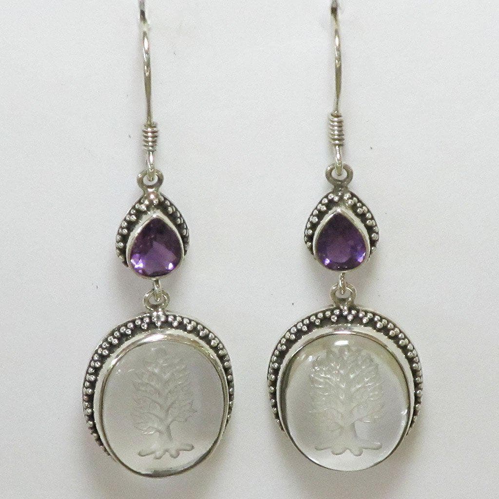 An outstanding pair of earrings made with polished quartz cabs that have a tree of life design hand-carved into them... Read more