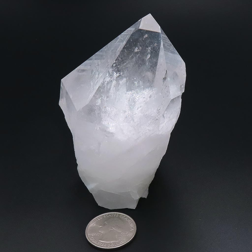 An outstanding clear quartz crystal point from Arkansas that has large silver veils that create beautiful rainbows. Stands up straight... Read more