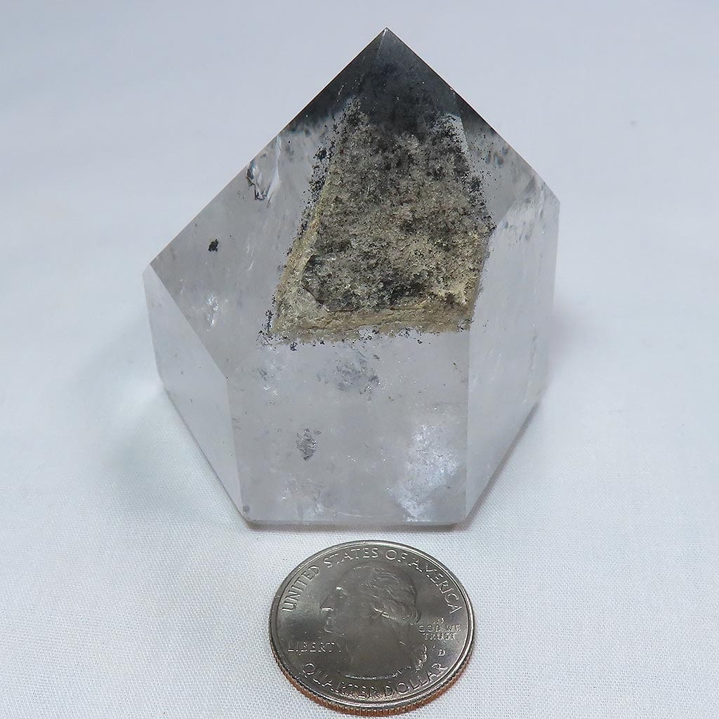 A fabulous polished quartz crystal phantom point from Brazil that has an easy-to-see grey manganese and white limonite phantom and... Read more