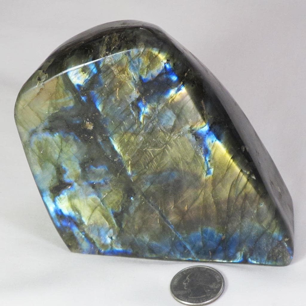 A marvelous all over polished labradorite free form shape from Madagascar that has lots of gold/blue/peach color flash on one... Read more