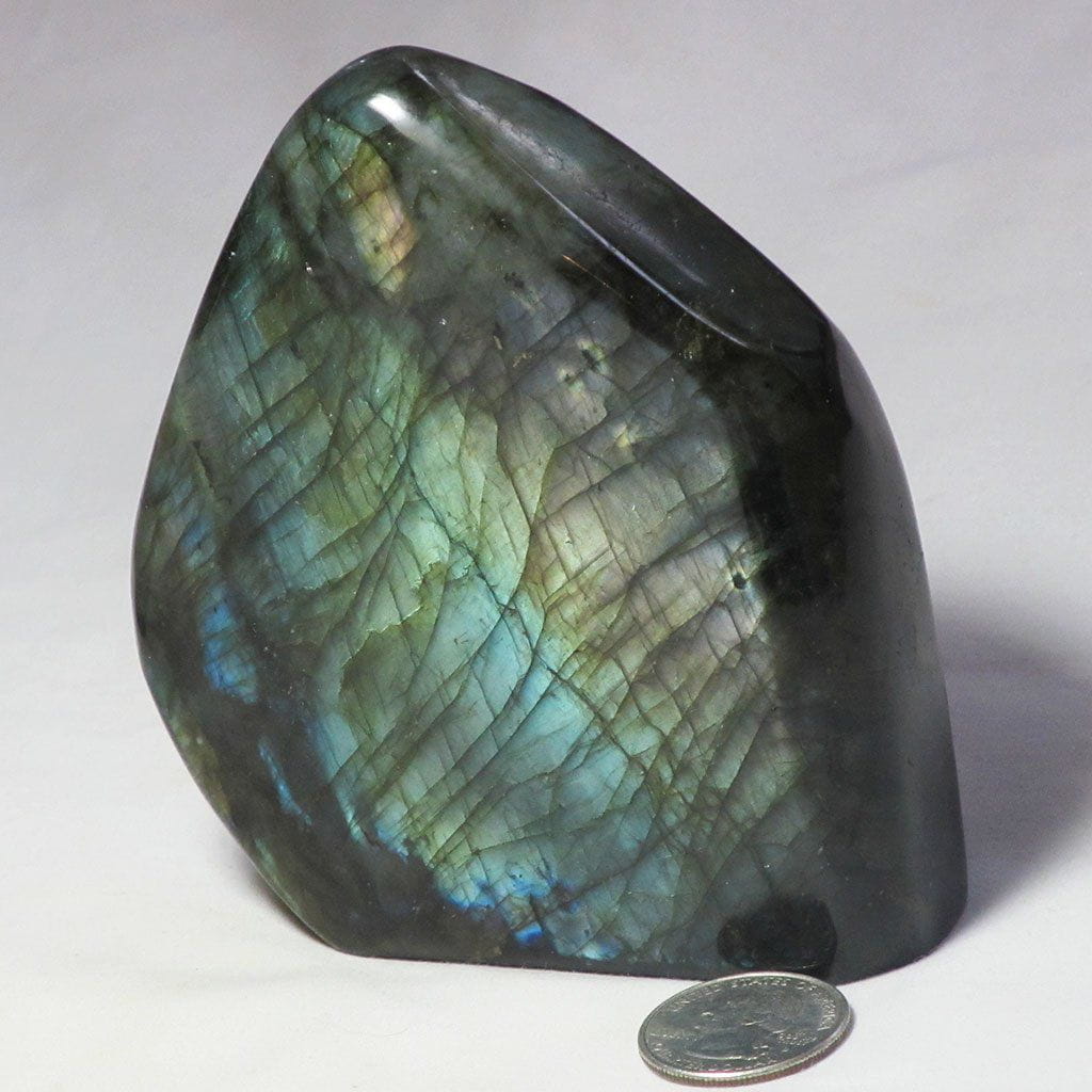 An outstanding all over polished labradorite free form shape from Madagascar that has lots of green/gold/purple color flash on one side.... Read more