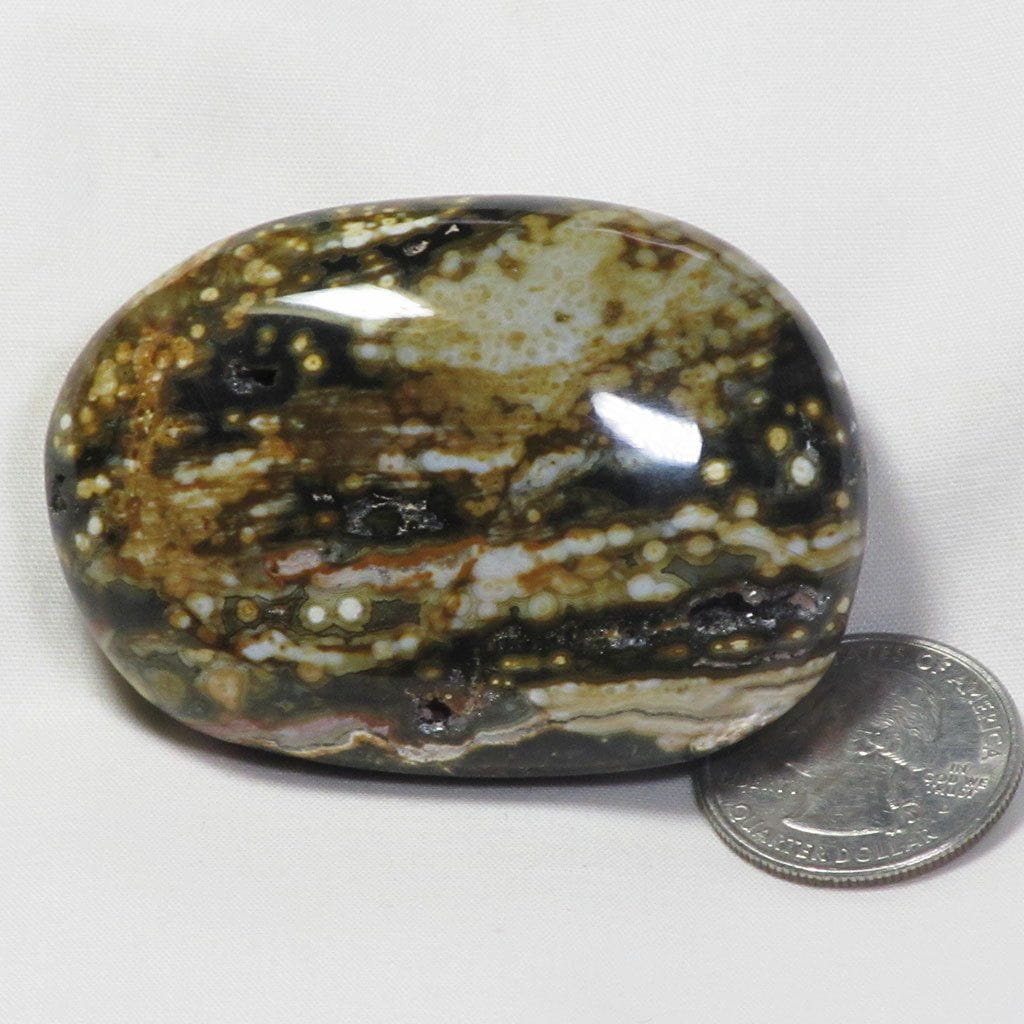 A marvelous hand polished ocean jasper palm stone from Madagascar that has a great pattern and small open voids with... Read more