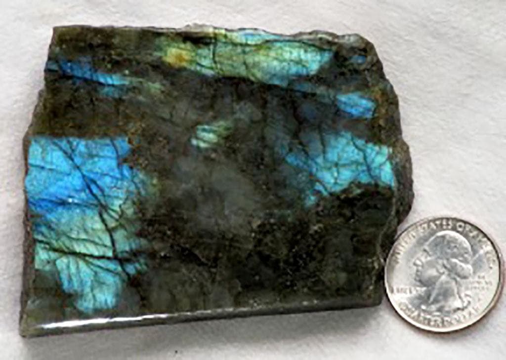 A wonderful one-side polished slab of labradorite from Madagascar. This very beautiful meditation stone displays gold/green/blue color flash. Size: 3"... Read more